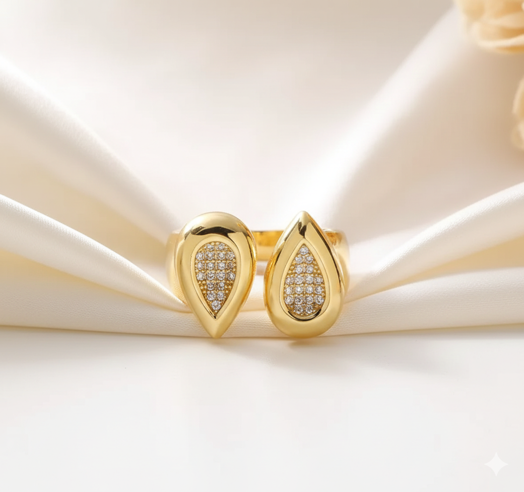 O Anel Aurora traduz sofisticação em cada curva. Seu design orgânico, com extremidades em formato de gota delicadamente cravejadas, cria um equilíbrio perfeito entre modernidade e elegância. Uma joia marcante, pensada para mulheres que apreciam detalhes refinados e peças que iluminam o visual com presença e delicadeza.