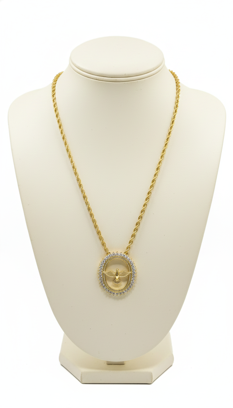 O pingente oval, detalhado com o Espírito Santo em alto relevo e rodeado por zircônias brilhantes, transmite luz, proteção e significado — uma peça criada para mulheres que desejam carregar sua espiritualidade com estilo.