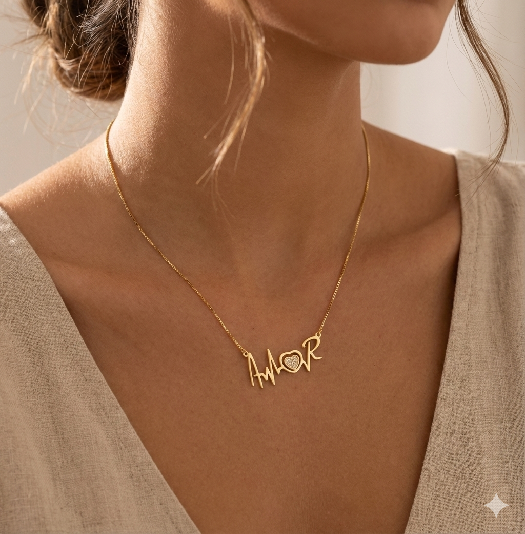 Com um design moderno e romântico, a peça destaca a palavra "Amor" conectada por uma linha que simula os batimentos cardíacos, simbolizando que o amor é a própria vida pulsando. O destaque central fica por conta da letra "O", estilizada em formato de coração e cravejada com zircônias brilhantes, trazendo um ponto de luz sofisticado que atrai todos os olhares.